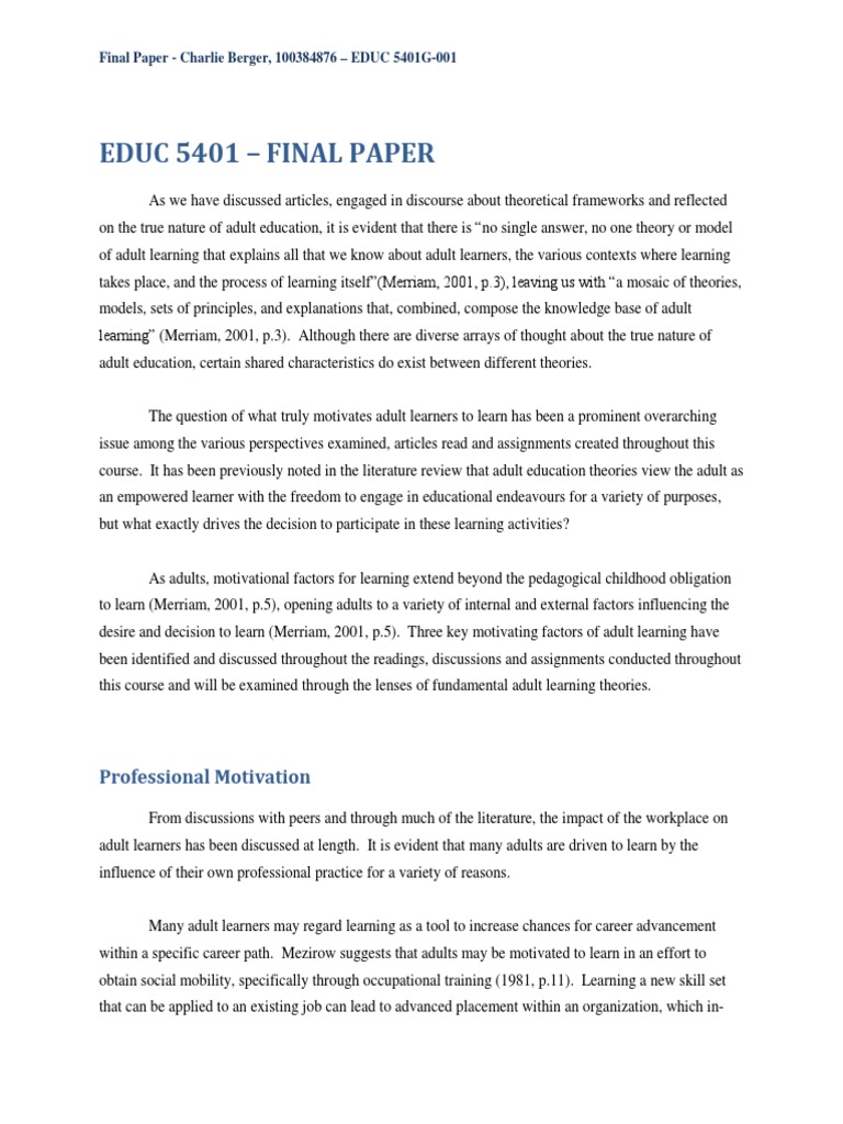 Educ 5401g Final Paper Considation Adult Education Motivation