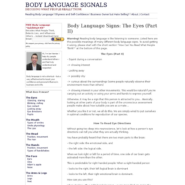 In this section you can find all than you need to know about body language signs and their meanings. The eyes are the windows of the soul and hence can send many non verbal body language signals. How to read body language.