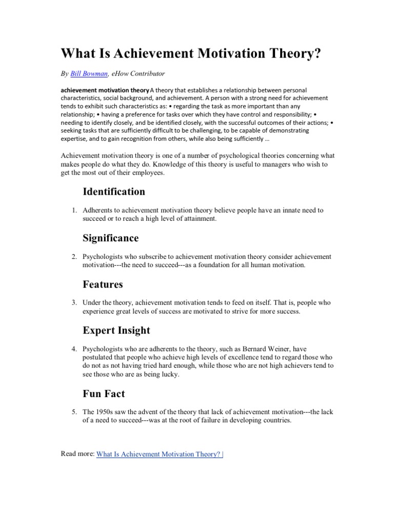 Study of achievement motivation in relation 163. They stated that a persons achievement oriented behavior is based on three parts. Three interacting factors that determine motivation are the main focus of goal theory.