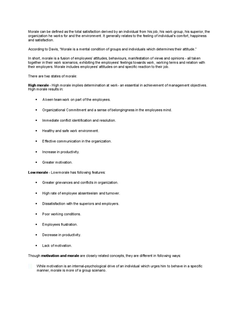 Morale Can Be Defined As The Total Satisfaction Derived By An